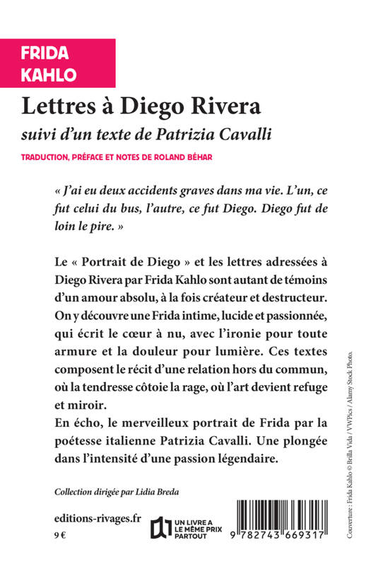 Ce petit recueil réunit, pour la première fois, les portraits hauts en couleur de Frida Kahlo par Patrizia Cavalli et de Diego Rivera par Frida Kahlo. Un nouveau regard sur leur destin, qui replace au coeur de leur histoire leur commune passion pour la peinture, qui les liait intimement : leur histoire d'amour tragique, vouée à un échec prévisible et lucidement prévu, se reflète dans une petite sélection de lettres que Frida a adressées à Diego, jusqu'à la fin de sa vie.