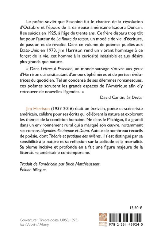 « Dans Lettres à Essenine, un monde sauvage s’ouvre aux yeux d’Harrison qui saisit autant d’amours éphémères et de pertes révélatrices du quotidien. Tel un condensé de ses dilemmes romanesques, ces poèmes scrutent les grands espaces de l’Amérique afin d’y retrouver de nouvelles légendes. » David Cantin, Le Devoir