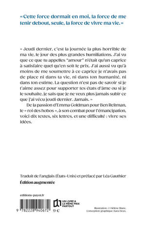 "Jeudi dernier, c'est la journée la plus horrible de ma vie, le jour des plus grandes humiliations. J'ai vu que ce que tu appelles "amour" n'était qu'un caprice à satisfaire quel qu'en soit le prix. J'ai aussi vu qu'à moins de me soumettre à ce caprice je n'avais pas de place ni dans ta vie, ni dans ton humanité, ni dans ton estime. La question n'est pas de savoir si je t'aime assez pour supporter tes états d'âme ou si je le souhaite, je sais que je ne veux plus jamais subir ce que j'ai vécu jeudi dernier. Jamais." De la passion d'Emma Goldman pour Ben Reitman, le "roi des hobos", à son combat pour l'émancipation, voici neuf textes, six lettres, et une difficulté : vivre ses idées.