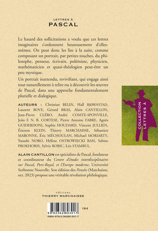 Le hasard des sollicitations a voulu que ces lettres imaginaires s’ordonnent heureusement d’elles-mêmes. On peut donc les lire à la suite, comme composant un portrait, par petites touches, du philosophe, penseur, écrivain, polémiste, physicien, mathématicien et quasi-théologien peut-être un peu mystique.<br /><br /><p>Un portrait inattendu, revivifiant, qui engage ainsi tout naturellement à relire ou à découvrir les oeuvres de Pascal, dans une approche fondamentalement plurielle et dialogique.</p><br /><b> AUTEURS </b>: Christian BELIN, Hall BJORNSTAD, Laurent BOVE, Gérard BRAS, Alain CANTILLON, Jean-Pierre CLÉRO, André COMTE-SPONVILLE, João F. N. B. CORTESE, Pierre Antoine FABRE, Agnès GUIDERDONI, Sophie HOUDARD, Vincent JULLIEN, Étienne KLEIN, Thierry MARCHAISSE, Sébastien MARONNE, Éric MÉCHOULAN, Michael MORIARTY, Yasushi NORO, Hélène OSTROWIECKI BAH, Sabine PROKHORIS, Sylvie ROBIC, Léo STAMBUL</p><br /><b> Alain CANTILLON </b> est spécialiste de Pascal, fondateur et coordinateur du <i>Centre d’études interdisciplinaires sur Pascal, Port-Royal, et l’Europe moderne</i>, Université Sorbonne Nouvelle. Son édition des <i> Pensées</i> (Marchaisse, oct. 2023) propose une véritable révolution philologique.