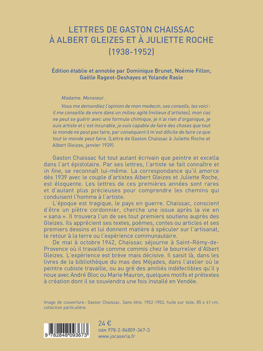 Au début des années 1940, dans une France coupée en deux par la guerre,<br /> le sort de Gaston Chaissac est peu enviable. L’artiste, sans métier ni moyens<br /> pour subsister, est hébergé à la cité sanitaire de Clairvivre depuis mai 1939.<br /> Jeanne et Otto Freundlich, qui dès 1937, l’avaient encouragé à peindre, lui<br /> organisèrent sa première exposition personnelle en 1938, à Paris, à la galerie<br /> Gerbo. L’exposition ne dura pas plus d’une dizaine de jours, elle ne reçut pas<br /> plus d’une dizaine de visiteurs. Juliette Roche et Albert Gleizes, qui avaient<br /> découvert en 1938 le travail de Chaissac dans l’atelier des Freundlich et acquis<br /> l’un de ses dessins, furent de ceux-là.<br /> À la suite de cette première rencontre, Gaston Chaissac entra en correspondance<br /> avec les Gleizes. Il leur aurait adressé une soixantaine de lettres entre 1938<br /> et 1949, demandant conseil sur le métier de peintre, rêvant sur l’artisanat rural<br /> ou les communautés d’artistes, informant sur le résultat de ses dernières<br /> trouvailles artistique