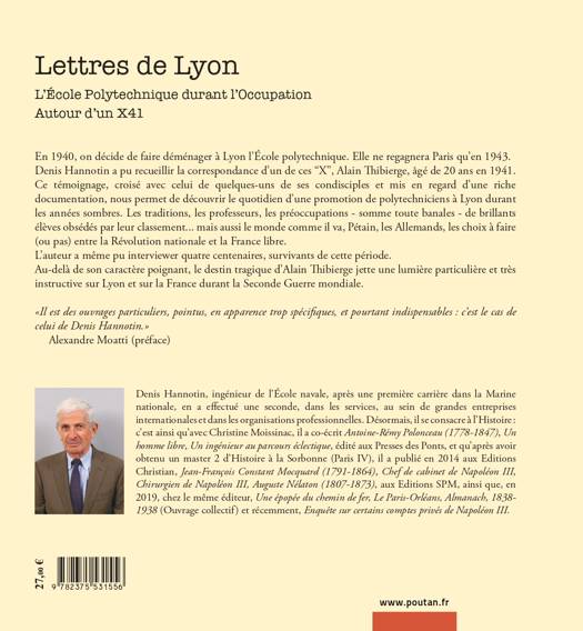 Ce témoignage, croisé avec celui de quelques-uns de ses condisciples et mis en regard d’une riche documentation, nous permet de découvrir le quotidien d’une promotion de polytechniciens à Lyon durant les années sombres. Les traditions, les professeurs, les préoccupations - somme toute banales - de brillants élèves obsédés par leur classement... mais aussi le monde comme il va, Pétain, les Allemands, les choix à faire (ou pas) entre la Révolution nationale et la France libre.