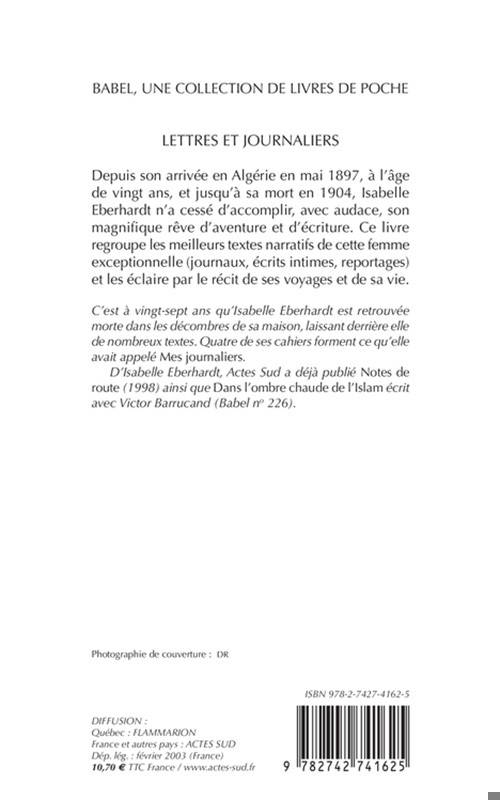 Depuis son arrivée en Algérie en mai 1897, à l'âge de vingt ans, et jusqu'à sa mort en 1904, Isabelle Eberhardt n'a cessé d'accomplir, avec audace, son magnifique rêve d'aventure et d'écriture. Ce livre regroupe les meilleurs textes narratifs de cette femme exceptionnelle (journaux, écrits intimes, reportages) et les éclaire par le récit de ses voyages et de sa vie.