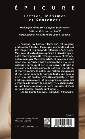 Pourquoi lire Epicure ? Parce qu'il est un grand philosophe ? Certes. Parce que son ecole eut une tres longue et tres profonde influence ? Sans doute. Mais aussi et surtout parce qu'il est a bien des egards notre contemporain (la remarque a souvent ete faite, notamment par Marcel Conche), et beaucoup plus, selon moi, qu'aucun autre philosophe de la Grece antique: parce qu'il pense un univers illimite et depourvu de finalite, comme le notre, un monde fini et mortel, comme le notre, une histoire dangereuse et incertaine, comme la notre, le tout a une epoque de crises et de bouleversements, comparable en cela a celle que nous vivons; et parce qu'il nous apprend a y trouver, a la mesure de nos moyens, le chemin d'un certain bonheur, adapte a notre finitude, et d'une certaine sagesse, ouverte sur l'infini. Andre Comte-Sponville