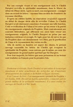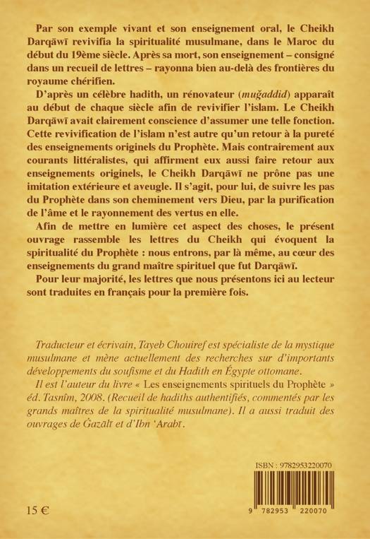 Par son exemple vivant et son enseignement oral, le Cheikh Darqâwî revivifia la spiritualité musulmane dans le Maroc du début du 19ème siècle. Après sa mort, son enseignement consigné dans un recueil de lettres rayonna bien au-delà des frontières du royaume chérifien. D'après un célèbre hadith, un rénovateur (mujaddid) apparaît au début de chaque siècle afin de revivifier l'islam. Le Cheikh Darqâwî avait clairement conscience d'assumer une telle fonction. Cette revivification de l'islam n'est autre qu'un retour à la pureté des enseignements originels du Prophète. Mais contrairement aux courants littéralistes, qui affirment eux aussi faire retour aux enseignements originels, le Cheikh Darqâwî ne prône pas une imitation extérieure et aveugle. Il s'agit, pour lui, de suivre les pas du Prophète dans son cheminement vers Dieu, par la purification de l'âme et le rayonnement des vertus en elle. Afin de mettre en lumière cet aspect des choses, le présent ouvrage rassemble les lettres du Cheikh qui évoquent la spiritualité du Prophète : nous entrons, par là même, au coeur des enseignements du grand maître spirituel que fut Darqâwî. Pour leur majorité, les lettres que nous présentons ici au lecteur sont traduites en français pour la première fois.
