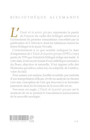 L'Etude de la poesie grecque represente la partie de l'oeuvre du cadet des Schlegel anterieure a l'avenement du premier romantisme concretise par la publication de l'Athenaum dont les initiateurs furent les freres Schlegel et le jeune Novalis. Contrairement a ce que semble indiquer la date d'impression de L'Etude de la poesie grecque (1797), c'est a partir de 1795 que Friedrich Schlegel redige son traite. A cette date, il est encore tenant d'une esthetique normative du Beau, objective et naturelle. Il lui oppose celle des Modernes qui releve, selon lui, du subjectif, de l'artifice, voire du laid. Pour autant, son analyse, fouillee et subtile, par endroits d'une interpretation delicate, revele un analyste en chemin vers une conception de l'art qui trouvera a se formuler justement dans les livraisons de la nouvelle revue. Vue sous cet angle, L'Etude de la poesie grecque est le moment cle ou se produit le basculement annonciateur de la nouvelle axiologie.