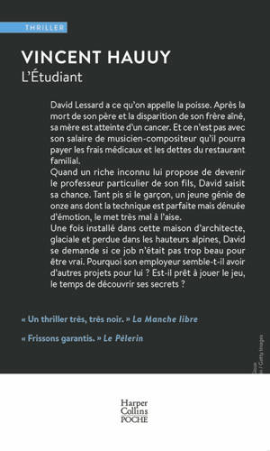 David Lessard a ce qu’on appelle la poisse. Après la mort de son père et la disparition de son frère aîné, sa mère est atteinte d’un cancer. Et ce n’est pas avec son salaire de musicien-compositeur qu’il pourra payer les frais médicaux et les dettes du restaurant familial. Quand un riche inconnu lui propose de devenir le professeur particulier de son fils, David saisit sa chance. Tant pis si le garçon, un jeune génie de onze ans dont la technique est parfaite mais dénuée d’émotion, le met très mal à l’aise. Une fois installé dans cette maison d’architecte, glaciale et perdue dans les hauteurs alpines, David se demande si ce job n’était pas trop beau pour être vrai. Pourquoi son employeur semble-t-il avoir d’autres projets pour lui ? Est-il prêt à jouer le jeu, le temps de découvrir ses secrets ?