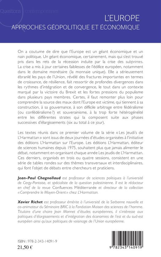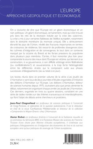 Ce premier volume de la série « Les Jeudi's de L'Harmattan » est consacré à l'Europe, un géant économique et un nain politique. La crise a ébranlé les pays de l'Union, révélé des fractures importantes en termes de croissance et de résilience, dans un contexte marqué par la victoire du Brexit et les pressions du populisme dans plusieurs pays membres. Il s'agit de comprendre les sources des maux dont l'Europe est victime, qui tiennent à son difficile arbitrage entre (con-) fédéralisme et souverainisme.