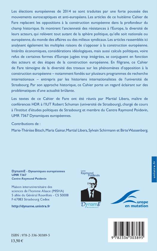 Les élections européennes de 2014 se sont traduites par une forte poussée des mouvements eurosceptiques et anti-européens. Les articles de ce huitième Cahier de Fare replacent les oppositions à la construction européenne dans la profondeur du champ historique. Ils montrent l'ancienneté des résistances à l'Europe, la diversité de leurs acteurs, qui relèvent tout autant de la sphère politique, du monde des affaires ou des milieux syndicaux.