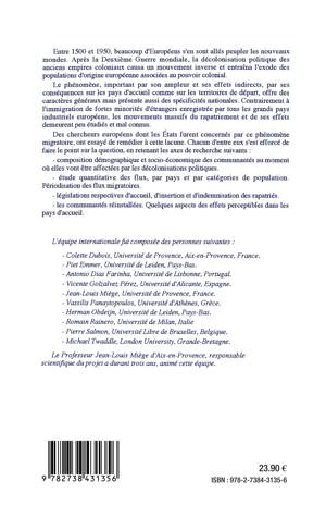 Entre 1500 et 1950, beaucoup d'Européens s'en sont allés peupler les nouveaux mondes. Après la Deuxième Guerre mondiale, la décolonisation politique des anciens empires coloniaux causa un mouvement inverse et entraîna l'exode des populations d'origine européenne associées au pouvoir colonial. Le phénomène, important par son ampleur et ses effets indirects, par ses conséquences sur les pays d'accueil comme sur les territoires de départ, offre des caractères généraux mais présente aussi des spécificités nationales. Contrairement à l'immigration de fortes minorités d'étrangers enregistrée par tous les grands pays industriels européens, les mouvements massifs du rapatriement et de ses effets demeurent peu étudiés et mal connus. Des chercheurs européens dont les Etats furent concernés par ce phénomène migratoire, ont essayé de remédier à cette lacune.