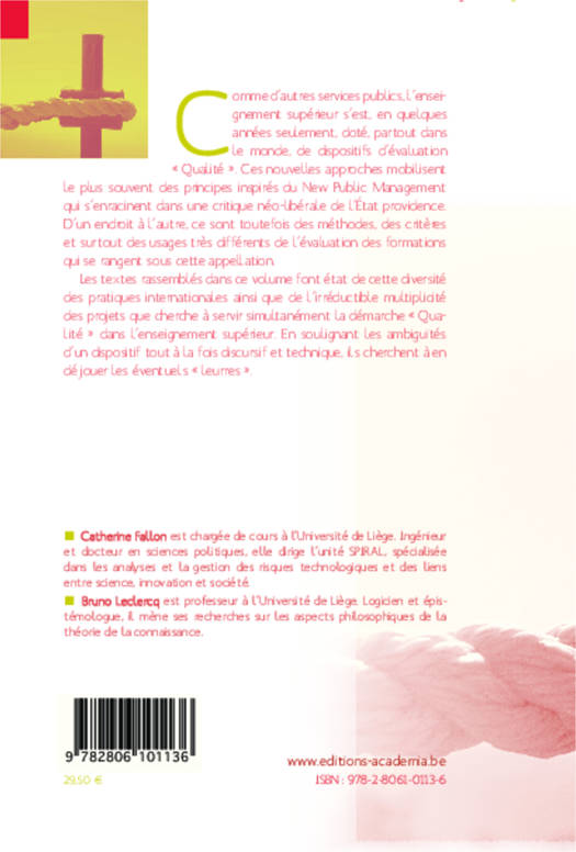 Les textes rassemblés dans ce volume font état de la diversité des pratiques internationales, en ce qui concerne les méthodes, les critères et surtout les usages très différents de l'évaluation des formations ainsi que de l'irréductible multiplicité des projets que cherche à servir simultanément la démarche « Qualité » dans l'enseignement supérieur. En soulignant les ambiguïtés d'un dispositif tout à la fois discursif et technique, ils cherchent à en déjouer les éventuels « leurres ».