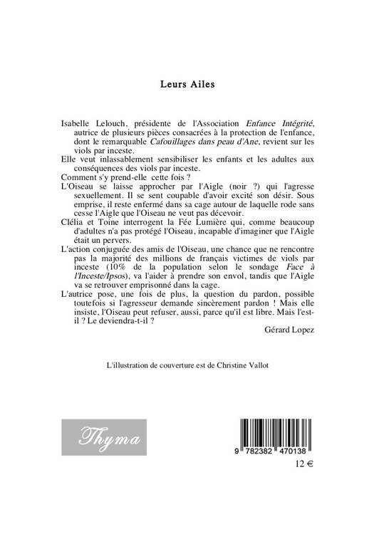Une pièce de théâtre pour les petits et pour les grands. L'Oiseau se laisse approcher par l'Aigle qui l'agresse sexuellement. Il se sent coupable d'avoir excité son désir. Sous emprise, il reste enfermé dans sa cage autour de laquelle rode sans cesse l'Aigle que l'Oiseau ne veut pas décevoir. Clélia et Toine interrogent la Fée Lumière qui, comme beaucoup d'adultes n'a pas protégé l'Oiseau, incapable d'imaginer que l'Aigle était un pervers. L'action conjuguée des amis de l'Oiseau va l'aider à prendre son envol, tandis que l'Aigle va se retrouver emprisonné dans la cage.