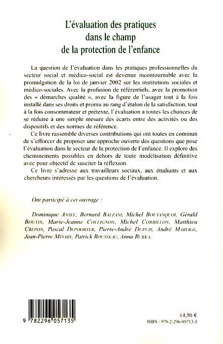 La question de l'évaluation dans les pratiques professionnelles du secteur social et médico-social est devenue incontournable avec la promulgation de la loi de janvier 2002 sur les institutions sociales et médico-sociales. Ce livre rassemble diverses contributions qui ont toutes en commun de s'efforcer de proposer une approche ouverte des questions que pose l'évaluation dans le secteur de la protection de l'enfance.