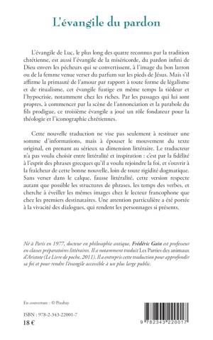 L'évangile de Luc est l'évangile de la miséricorde, du pardon infini de Dieu envers les pécheurs qui se convertissent. Mais s'il affirme la primauté de l'amour par rapport à toute forme de légalisme et de ritualisme, cet évangile fustige en même temps la tiédeur et l'hypocrisie, notamment chez les riches. Cette nouvelle traduction vise à épouser le mouvement du texte original, en prenant au sérieux sa dimension littéraire. Le traducteur n'a pas voulu choisir entre littéralité et inspiration : c'est par la fidélité à l'esprit des phrases grecques qu'il a voulu rejoindre la foi, et s'ouvrir à la fraîcheur de cette bonne nouvelle, loin de toute rigidité dogmatique. Sans verser dans le calque, cette version respecte autant que possible les structures de phrases, les temps des verbes, et cherche à éveiller les mêmes images chez le lecteur que chez les premiers destinataires.