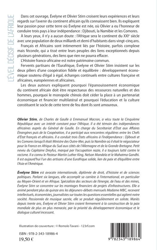 Dans cet ouvrage, Évelyne et Olivier Stirn croisent leurs expériences et leurs regards sur l'avenir du continent africain. À leurs yeux, il n'y a aucun doute : l'Afrique sera le continent du XXIe siècle avec une population de deux milliards et demi d'habitants dans vingt-cinq ans. Fervents partisans de l'Eurafrique, ils insistent sur les deux piliers d'une coopération fidèle et équilibrée : développement économique soutenu d'égal à égal, échanges continuels entre cultures française et africaines, européennes et africaines.
