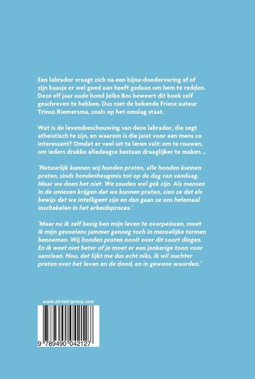 Een labrador vraagt zich na een bijna-doodervaring af of zijn baasje er wel goed aan heeft gedaan om hem te redden. Deze elf jaar oude hond Jelke Bos beweert dit boek zelf geschreven te hebben. Dus niet de bekende Friese auteur Trinus Riemersma, zoals op het omslag staat. Wat is de levensbeschouwing van deze labrador, die zegt atheïstisch te zijn, en waarom is die juist voor een mens zo interessant? Omdat er veel uit te leren valt: om te rouwen, om ieders drukke alledaagse bestaan draaglijker te maken ...