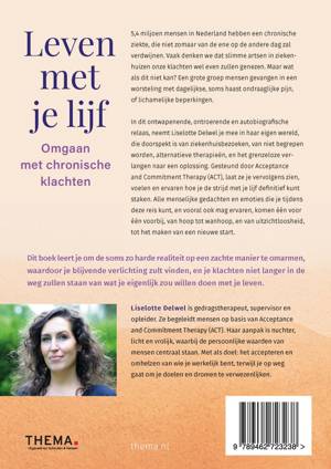 Leven met je lijf is een ontwapenend, ontroerend en autobiografisch verhaal van Liselotte Delwel. Ze neemt je mee in een wereld, doorspekt van ziekenhuisbezoeken, van niet begrepen worden, de zoektocht naar alternatieve therapieën en het grenzeloze verlangen naar een oplossing. Gesteund door Acceptance and Commitment Therapy (ACT) laat ze je zien, voelen en ervaren hoe je de strijd met je lijf definitief kunt stoppen. Alle herkenbare gedachten en emoties die je kunt en vooral ook mag ervaren, komen voorbij. Van hoop tot wanhoop, en van uitzichtloosheid tot het kunnen creëren van een nieuw uitzicht: het maken van een nieuwe start.