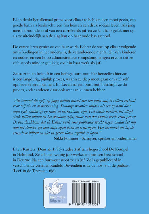 Ze stort in en belandt in een heftige burn-out. Het herstellen hiervan is een langdurig, pijnlijk proces, waarin ze diep moet gaan om zichzelf opnieuw te leren kennen. In 'Leven na een burn-out' beschrijft ze dit proces, zodat anderen daar ook wat aan kunnen hebben.