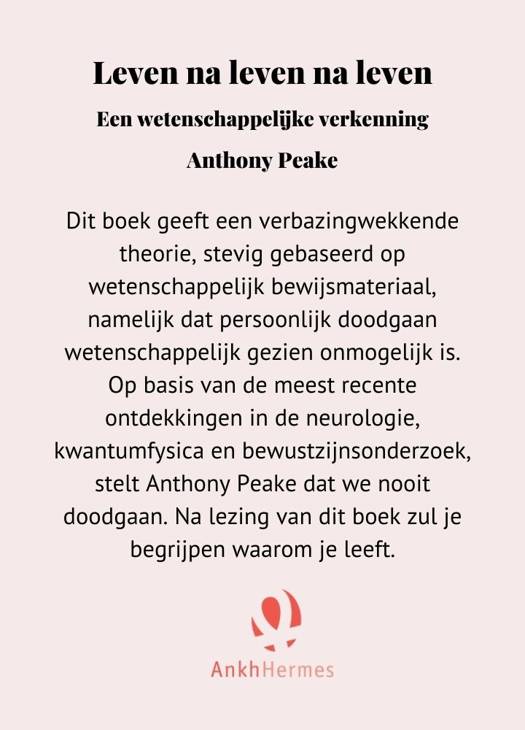 Persoonlijk doodgaan is wetenschappelijk gezien onmogelijk Het leven is niet wat het lijkt te zijn. Heb je wel eens het vreemde gevoel dat bekendstaat als déjà vu? Heb je af en toe het gevoel dat je weet wat er zo meteen gaat gebeuren? Heb je ook wel vaker het sterke gevoel dat dingen die je op het punt staat te doen, juist (of verkeerd) zijn? Dit soort waarnemingen zouden wel eens simpelweg aanwijzingen kunnen zijn dat je onsterfelijk bent. Dit boek geeft een verbazingwekkende theorie, stevig gebaseerd op wetenschappelijk bewijsmateriaal, namelijk dat persoonlijk doodgaan wetenschappelijk gezien onmogelijk is. Op basis van de meest recente ontdekkingen in de neurologie, kwantumfysica en bewustzijnsonderzoek, stelt Anthony Peake dat we nooit doodgaan. Na lezing van dit boek zul je begrijpen waarom je leeft