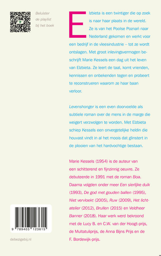 Levenshonger is een even doorvoelde als subtiele roman over de mens in de marge die weigert verzwolgen te worden. Met Elzbieta schiep Kessels een onvergetelijke heldin die houvast vindt in al het moois dat glinstert in de plooien van het hardvochtige bestaan.