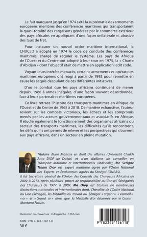 Ce livre retrace l'histoire des transports maritimes en Afrique de l'Ouest et du Centre de 1968 à 2018. De manière exhaustive, l'auteur revient sur les combats victorieux, les échecs et les compromis menés par les acteurs gouvernementaux et associatifs en Afrique. Il étudie également le fonctionnement des organismes africains du secteur des transports maritimes, les difficultés qu'ils rencontrent, les défis qu'ils ont permis de relever et les perspectives qui s'ouvrent aux pays africains, dans un secteur en pleine mutation