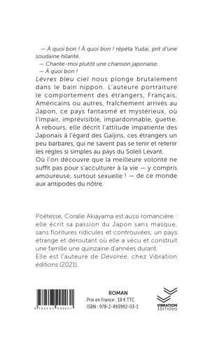 — à quoi bon ! à quoi bon ! répéta Yudai, prit d’une soudaine hilarité. — Chante-moi plutôt une chanson japonaise. — à quoi bon ! Lèvres bleu ciel nous plonge brutalement dans le bain nippon. L’auteure portraiture le comportement des étrangers, Français, Américains ou autres, fraîchement arrivés au Japon, ce pays fantasmé et mystérieux, où l’impair, imprévisible, impardonnable, guette. à rebours, elle décrit l’attitude impatiente des Japonais à l’égard des Gaïjins, ces étrangers un peu barbares, qui ne savent pas se tenir et retenir les règles si simples au pays du Soleil Levant. Où l’on découvre que la meilleure volonté ne suffit pas pour s’acculturer à la vie — y compris amoureuse, surtout sexuelle ! — de ce monde aux antipodes du nôtre.