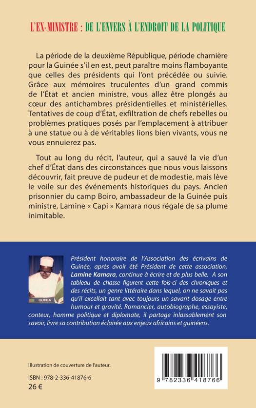 La période de la deuxième République, période charnière pour la Guinée s'il en est, peut paraître moins flamboyante que celles des présidents qui l'ont précédée ou suivie. Grâce aux mémoires truculentes d'un grand commis de l' État et ancien ministre, vous allez être plongés au coeur des antichambres présidentielles et ministérielles. Tentatives de coup d'État, exfiltration de chefs rebelles ou problèmes pratiques posés par l'emplacement à attribuer à une statue ou à de véritables lions bien vivants, vous ne vous ennuierez pas. Tout au long du récit, l'auteur, qui a sauvé la vie d'un chef d État dans des circonstances que nous vous laissons découvrir, fait preuve de pudeur et de modestie, mais lève le voile sur des événements historiques du pays. Ancien prisonnier du camp Boiro, ambassadeur de la Guinée puis ministre, Lamine Capi Kamara nous régale de sa plume inimitable.