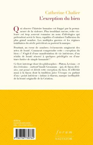 Qui observe l'histoire humaine est frappé par la permanence de la violence. Plus troublant encore, cette violence est trop souvent commise au nom d'idéologies qui prétendent servir le bien, capables d'entraîner l'adhésion du plus grand nombre. Les multiples guerres et les régimes totalitaires du siècle précédent en portent la marque. Pourtant, au coeur de sombres événements surgissent des actes de bonté. Comment comprendre cette « exception du bien » ? S'agit-il d'une manifestation de vie intérieure, d'un résidu de bonté réservé à quelques privilégiés ou d'une trace furtive de simple humanité ? Ce livre interroge donc des philosophes – Platon, Levinas – et des écrivains – surtout Vassili Grossman – qui, de façon décisive, ont pensé et décrit cette exception du bien. Il réfléchit aussi à la façon dont la tradition juive l'évoque en parlant d'un « point intérieur » intime à chacun, marque ineffaçable de la bonté originelle de la Création.