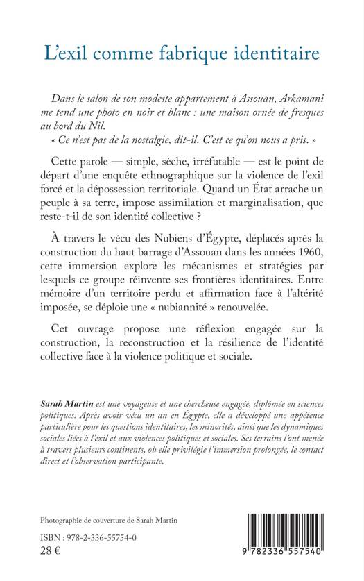 Dans le salon de son modeste appartement à Assouan, Arkamani me tend une photo en noir et blanc: une maison ornée de fresques au bord du Nil. Ce n'est pas de la nostalgie, dit-il. C'est ce qu'on nous a pris. Cette parole - simple, sèche, irréfutable - est le point de départ d'une enquête ethnographique sur la violence de l'exil forcé et la dépossession territoriale. Quand un État arrache un peuple à sa terre, impose assimilation et marginalisation, que reste-t-il de son identité collective ? À travers le vécu des Nubiens d'Égypte, déplacés après la construction du haut barrage d'Assouan dans les années 1960, cette immersion explore les mécanismes et stratégies par lesquels ce groupe réinvente ses frontières identitaires. Entre mémoire d'un territoire perdu et affirmation face à l'altérité imposée, se déploie une nubiannité renouvelée. Cet ouvrage propose une réflexion engagée sur la construction, la reconstruction et la résilience de l'identité collective face à la violence politique et sociale.