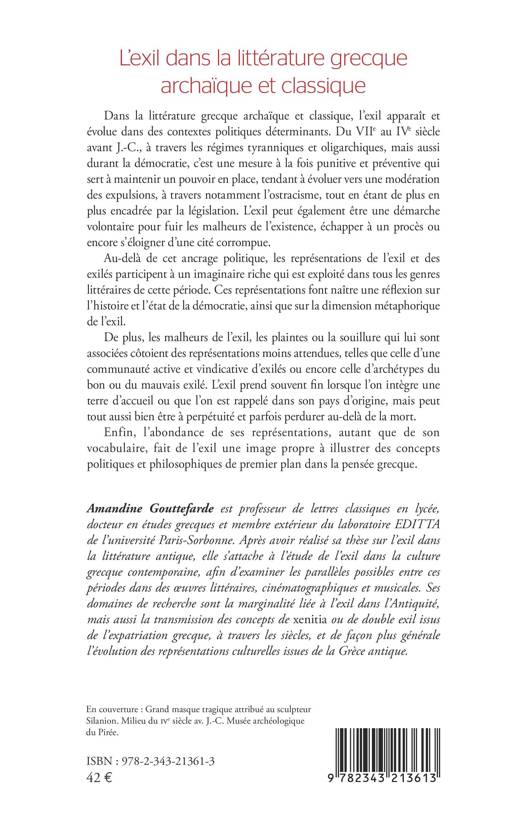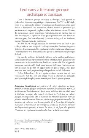 Dans la littérature grecque archaïque et classique, l'exil apparaît et évolue dans des contextes politiques déterminants. Du VIIe au IVe siècle avant J.-C., à travers les régimes tyranniques et oligarchiques, mais aussi durant la démocratie, c'est une mesure à la fois punitive et préventive qui sert à maintenir un pouvoir en place, tendant à évoluer vers une modération des expulsions, à travers notamment l'ostracisme, tout en étant de plus en plus encadrée par la législation. Au-delà de cet ancrage politique, les représentations de l'exil et des exilés participent à un imaginaire riche qui est exploité dans tous les genres littéraires de cette période. Ces représentations font naître une réflexion sur l'histoire et l'état de la démocratie, ainsi que sur la dimension métaphorique de l'exil. De plus, les malheurs de l'exil, les plaintes ou la souillure qui lui sont associées côtoient des représentations moins attendues, telles que celle d'une communauté active et vindicative d'exilés ou encore celle d'archétypes du bon ou du mauvais exilé. Enfin, l'abondance de ses représentations, autant que de son vocabulaire, fait de l'exil une image propre à illustrer des concepts politiques et philosophiques de premier plan dans la pensée grecque.