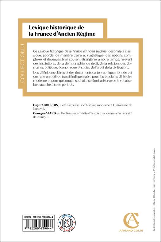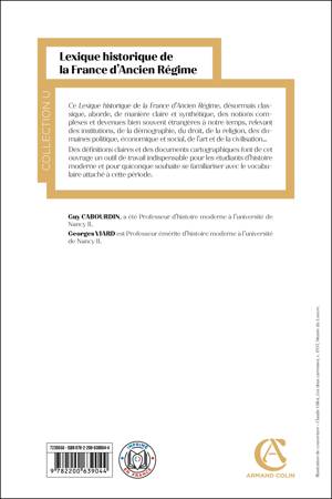 Ce Lexique historique de la France d’Ancien Régime, désormais classique, aborde, de manière claire et synthétique, des notions complexes et devenues bien souvent étrangères à notre temps, relevant des institutions, de la démographie, du droit, de la religion, des domaines politique, économique et social, de l’art et de la civilisation… Des définitions claires et des documents cartographiques font de cet ouvrage un outil de travail indispensable pour les étudiants d’histoire moderne et pour quiconque souhaite se familiariser avec le vocabulaire attaché à cette période.