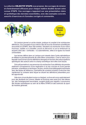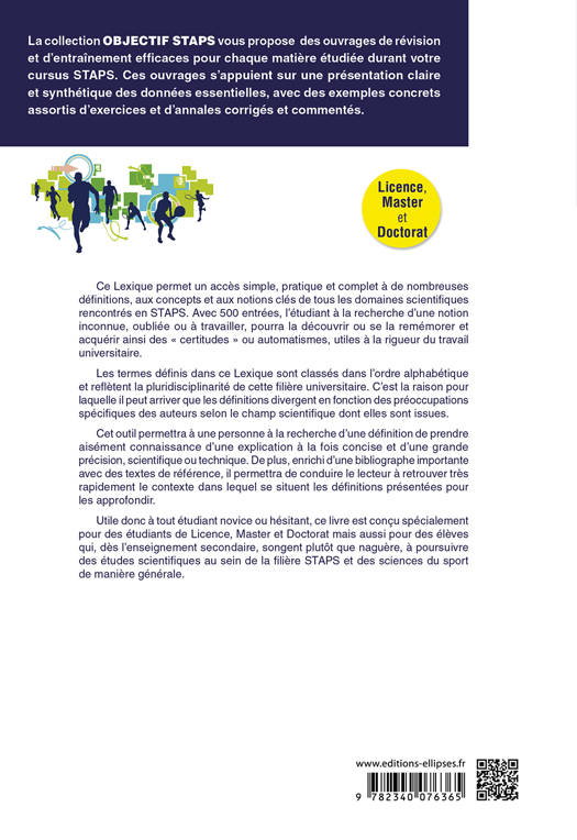 Ce lexique permet un accès simple, pratique et complet à de nombreuses définitions, aux concepts et aux notions clés de tous les domaines scientifiques rencontrés en STAPS.