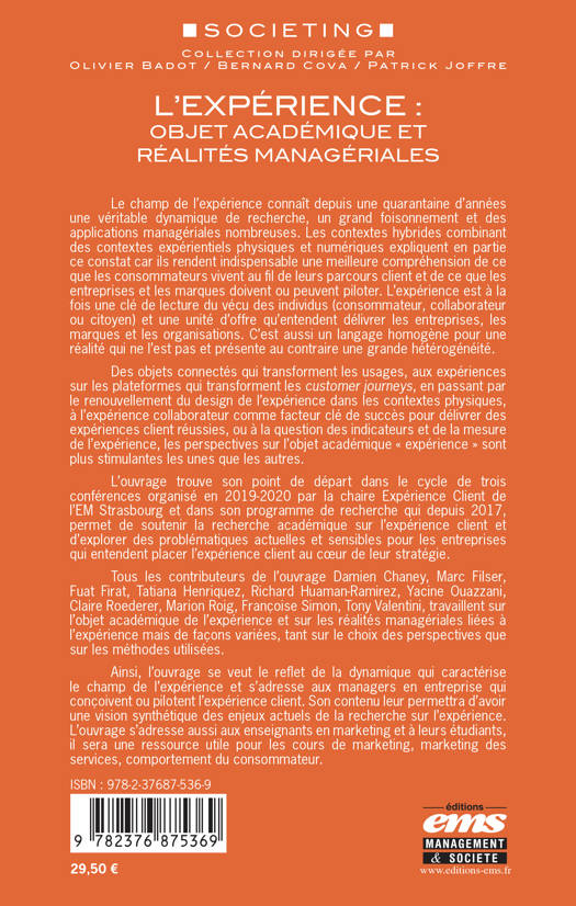 Ainsi, l'ouvrage se veut le reflet de la dynamique qui caractérise le champ de l'expérience et s'adresse aux managers en entreprise qui conçoivent ou pilotent l'expérience client. Son contenu leur permettra d'avoir une vision synthétique des enjeux actuels de la recherche sur l'expérience. L'ouvrage s'adresse aussi aux enseignants en marketing et à leurs étudiants, il sera une ressource utile pour les cours de marketing, marketing des services, comportement du consommateur.