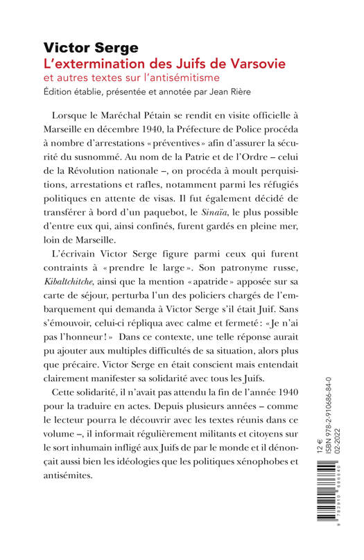 Ce recueil rassemble des textes contemporains de l'extermination des Juifs durant la Seconde Guerre mondiale. V. Serge y évoque les questions de l'antisémitisme ainsi que la xénophobie idéologique et politique qui règne en Europe au cours de cette période.