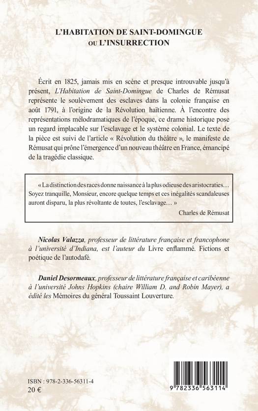 L'Habitation de Saint-Domingue de Charles de Rémusat représente le soulèvement des esclaves dans la colonie française en août 1791, à l'origine de la Révolution haïtienne. À l'encontre des représentations mélodramatiques de l'époque, ce drame historique pose un regard implacable sur l'esclavage et le système colonial. Le texte de la pièce est suivi de l'article Révolution du théâtre, le manifeste de Rémusat qui prône l'émergence d'un nouveau théâtre en France, émancipé de la tragédie classique.