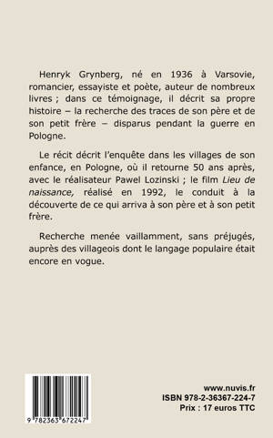 Henryk Grynberg, né en 1936 à Varsovie, romancier, essayiste et poète, auteur de nombreux livres; dans ce témoignage, il décrit sa propre histoire - la recherche des traces de son père et de son petit frère - disparus pendant la guerre en Pologne.Le récit décrit l'enquête dans les villages de son enfance, en Pologne, où il retourne 50 ans après, avec le réalisateur Pawel Lozinski ; le film Lieu de naissance, réalisé en 1992, le conduit à la découverte de ce qui arriva à son père et à son petit frère.Recherche menée vaillamment, sans préjugés, auprès des villageois dont le langage populaire était encore en vogue.