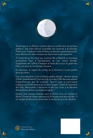 Tandis que le roi Ethayn s'enlise dans un conflit sans fin en pays andhem, son frère Kernyl consolide son autorité à la capitale. Prêt à tout, il sollicite l'aide d'Helya, la dernière descendante feä, pour déjouer les viles manoeuvres des ennemis du royaume. À l'aube de ses dix-neuf ans, la jeune fille a délaissé sa mystique ascendance face à l'éclatement de son noyau familial. Supplantée par l'effroi d'intégrer le faste de la cour, la grâce des Feä n'est plus qu'un lointain souvenir. Et pourtant, le regard du soldat de la fontaine s'invite parfois dans ses rêves. Ces yeux perçants n'ont d'ailleurs guère changé : devenu garde d'élite, Gweth attend l'arrivée à la cour de la fille-fée avec autant d'appréhension que de curiosité. Sent-il venir la bourrasque magique qui bouleversera sa vie bien rangée ? Saisit-il l'intention des Feä, déterminés à éprouver le lien qui l'unit à la dernière descendante de leur prestigieuse lignée ? Quand une menace émerge sous la forme d'un art ancien et illicite, Gweth et Helya réalisent qu'ils ne peuvent plus reculer ; il est temps de découvrir, ensemble, le secret du pouvoir des Feä.