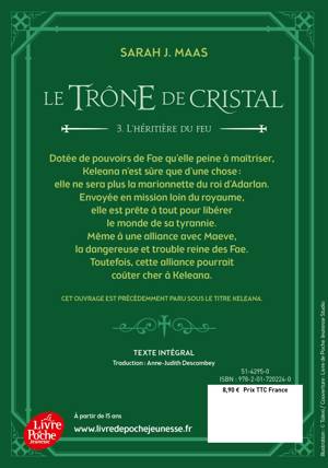 Dotée de pouvoirs de Fae qu'elle peine à maîtriser, Keleana n'est sûre que d'une chose : elle ne sera plus la marionnette du roi d'Adarlan. Envoyée en mission loin du royaume, elle est prête à tout pour libérer le monde de sa tyrannie. Mais, seule Maeve, la dangereuse et trouble reine des Fae pourrait apporter les réponses à ses questions et les armes pour défaire le roi. Et cette alliance pourrait coûter cher à Keleana.