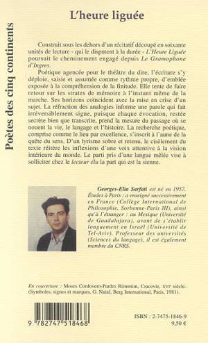 Construit sous les dehors d'un récitatif découpé en soixante unités de lecture L'Heure liguée poursuit le cheminement engagé depuis Le Gramophone d'Ingres. Poètique agencée pour le théâtre du dire, l'écriture s'y déploie, saisie et assumée comme rythme propre, d'emblée exposée à la compréhension de la finitude. Ce livre a reçu le Prix Louise Labé en 2003.