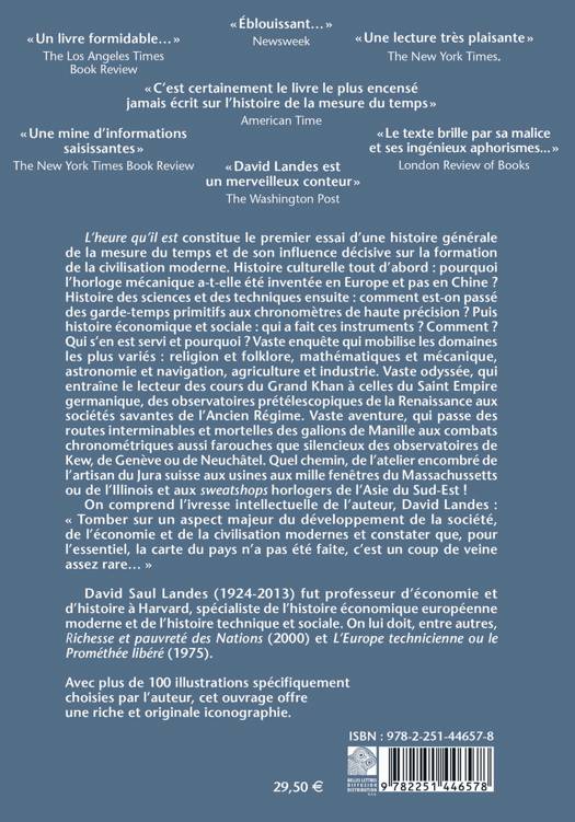 L'heure qu'il est constitue le premier essai d'une histoire generale de la mesure du temps et de son influence decisive sur la formation de la civilisation moderne. Histoire culturelle tout d'abord: pourquoi l'horloge mecanique a-t-elle ete inventee en Europe et pas en Chine ? Histoire des sciences et des techniques ensuite: comment est-on passe des garde-temps primitifs aux chronometres de haute precision ? Puis histoire economique et sociale: qui a fait ces instruments ? Comment ? Qui s'en est servi et pourquoi ? Vaste enquete qui mobilise les domaines les plus varies: religion et folklore, mathematiques et mecanique, astronomie et navigation, agriculture et industrie. Vaste odyssee, qui entraine le lecteur des cours du Grand Khan a celles du Saint Empire germanique, des observatoires pretelescopiques de la Renaissance aux societes savantes de l'Ancien Regime. Vaste aventure, qui passe des routes interminables et mortelles des galions de Manille aux combats chronometriques aussi farouches que silencieux des observatoires de Kew, de Geneve ou de Neuchatel. Quel chemin, de l'atelier encombre de l'artisan du Jura suisse aux usines aux mille fenetres du Massachussetts ou de l'Illinois et aux sweatshops horlogers de l'Asie du Sud-Est ! On comprend l'ivresse intellectuelle de l'auteur, David Landes: Tomber sur un aspect majeur du developpement de la societe, de l'economie et de la civilisation modernes et constater que, pour l'essentiel, la carte du pays 'a pas ete faite, c'est un coup de veine assez rare...