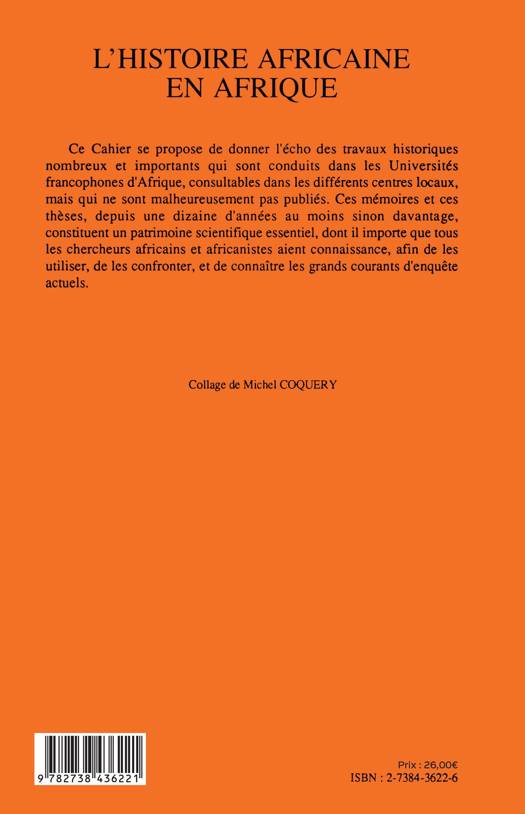 Ce Cahier se propose de donner l'écho des travaux historiques nombreux et importants qui sont conduits dans les Universités francophones d'Afrique, consultables dans les différents centres locaux, mais qui ne sont malheureusement pas publiés. Ces mémoires et ces thèses, depuis une dizaine d'années au moins sinon davantage, constituent un patrimoine scientifique essentiel, dont il importe que tous les chercheurs africains et africanistes aient connaissance, afin de les utiliser, de les confronter, et de connaître les grands courants d'enquête actuels.