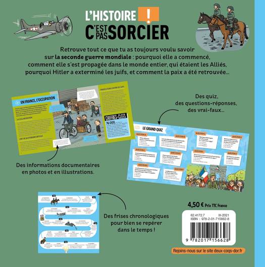 Retrouve tout ce que tu as toujours voulu savoir sur la seconde guerre mondiale : pourquoi elle a commencé, comment elle s'est propagée dans le monde entier, qui étaient les Alliés, pourquoi Hitler a exterminé les juifs, et comment la paix a été retrouvée... Des quiz, des questions-réponses, des vrai-faux... Des informations documentaires en photos et en illustrations. Des frises chronologiques pour bien se repérer dans le temps !
