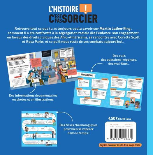 Un mix d'informations, de quiz, de chiffres clés, de photos et d'illustrations sur Martin Luther King. Les événements-clés de la vie de cette personnalité qui a marqué l'Histoire : sa lutte contre la ségrégation raciale, son engagement pacifiste en faveur des droits civiques, son célèbre discours « I have a dream », jusqu'à son assassinat à Memphis en 1968. Avec une frise chronologique pour aider l'enfant à se repérer dans le temps.