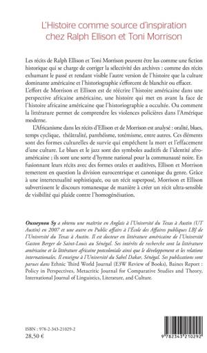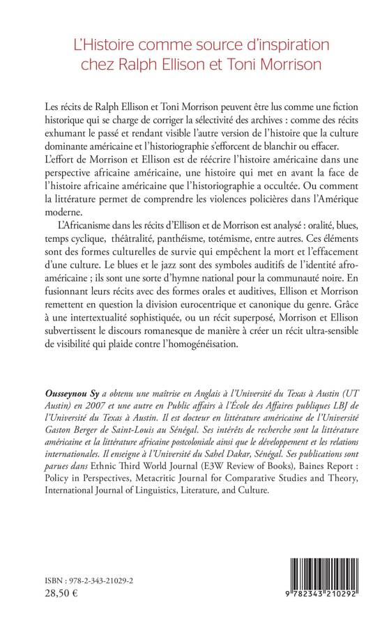 Les récits de Ralph Ellison et Toni Morrison peuvent être lus comme une fiction historique qui se charge de corriger la sélectivité des archives. Leurs efforts est de réécrire l'histoire américaine dans une perspective africaine américaine, une histoire qui met en avant la face de l'histoire africaine américaine que l'historiographie a occultée. Ou comment la littérature permet de comprendre les violences policières dans l'Amérique moderne. L'Africanisme dans les récits d'Ellison et de Morrison est analysé oralité, blues, temps cyclique, théâtralité, panthéisme, totémisme, entre autres. Ces éléments sont des formes culturelles de survie qui empêchent la mort et l'effacement d'une culture.