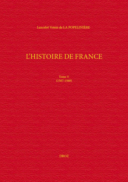 Le volume V regroupe les livres 11, 12 et 13 de L’Histoire de France. Il traite de la deuxième guerre civile, de la surprise de Meaux (26-28 septembre 1567) à la paix de Longjumeau confirmée par l’octroi de l’édit de Paris du 23 mars 1568. Il inclut les batailles de St-Denis et de Cognat, ainsi que le siège de Chartres. Comme à son habitude, l’auteur déborde largement du seul cas français en insérant des paragraphes sur les affaires des pays voisins. Cependant, deux éléments sont à noter. D’une part les trois livres du présent volume sont les trois premiers livres de La Vraye et entière histoire dans sa version de 1572. Ceci permet d’établir des comparaisons en vue de faire apparaître le travail de recomposition auquel se sont livrés l’auteur et l’éditeur. D’autre part, le « narré » des combats livrés en Poitou et Aunis sont de première main puisque La Popelinière, enfant du pays, a participé à ces affrontements. La combinaison de ces deux facteurs renforce la tonalité personnelle du récit.