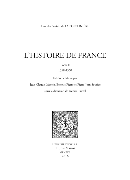 Ce second volume de L’Histoire de France de La Popelinière, parue en 1581, offre dans les livres 5 et 6 un récit des années 1557-1560. La Popelinière compose un vaste récit de la période qui mène de la fin du règne du roi Henri II à la mort de François II : outre les événements du royaume (tels que le traité de Cateau-Cambrésis, l’affaire Anne du Bourg, la montée des mécontentements politiques et religieux, la conjuration d’Amboise), il accorde une place importante à l’intervention française en Ecosse. Surtout, il s’intéresse à l’Amérique, à travers l’expédition de Villegagnon au Brésil, qu’il reprendra et développera l’année suivante dans Les Trois Mondes. Puisant principalement ses sources dans les écrits protestants, il les coupe et les réorganise à son gré, les neutralise en enlevant appellations injurieuses et jugements partiaux. Il les enrichit enfin de précisions et de nombreux documents, afin d’atteindre son but : écrire une histoire non partisane. Comme dans le premier volume, les notes critiques identifient personnages et lieux, éclairent la chronologie et analysent l’utilisation des sources.