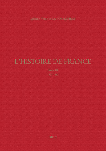 Ce troisième tome de L’Histoire de France de La Popelinière, parue en 1581, est centré sur deux années cruciales, 1561 et 1562, qui voient le déclenchement des guerres de Religion. Il fait le récit des principaux événements de l’avènement de Charles IX jusqu’à l’automne 1562 : les Etats généraux et le colloque de Poissy, l’édit de Janvier, le « meurtre » de Wassy, les déclarations du prince de Condé et ses négociations avec les princes allemands, l’engagement puis les hésitations de la noblesse réformée, et s’attarde sur quelques épisodes de la première guerre civile (particulièrement Angers et Toulouse). Hors de France, il s’intéresse aussi à la résistance armée des vaudois du Piémont contre le duc de Savoie, et décrit la « république des Suisses ». Les notes critiques s’attachent principalement, comme dans les volumes précédents, à retrouver les sources utilisées et à éclairer le travail de recomposition et de neutralisation de l’historien sur ses sources.