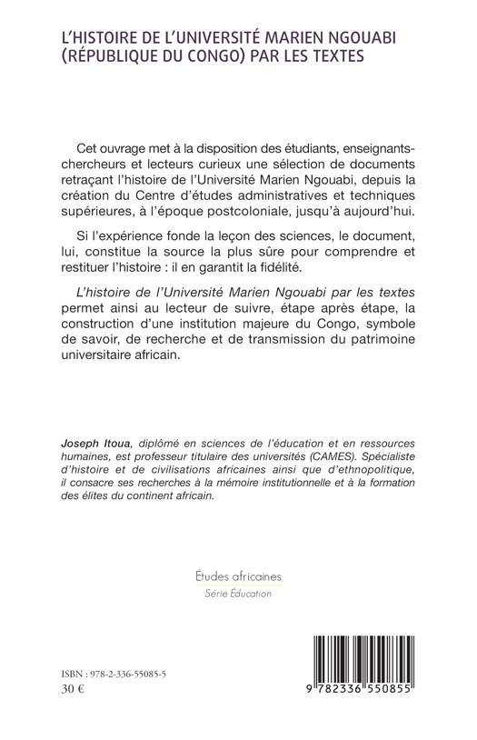 Cet ouvrage met à la disposition des étudiants, enseignants-chercheurs et lecteurs curieux une sélection de documents retraçant l'histoire de l'Université Marien Ngouabi, depuis la création du Centre d'études administratives et techniques supérieures, à l'époque postcoloniale, jusqu'à aujourd'hui. Si l'expérience fonde la leçon des sciences, le document, lui, constitue la source la plus sûre pour comprendre et restituer l'histoire il en garantit la fidélité. L'histoire de l'Université Marien Ngouabi par les textes permet ainsi au lecteur de suivre, étape après étape, la construction d'une institution majeure du Congo, symbole de savoir, de recherche et de transmission du patrimoine universitaire africain.