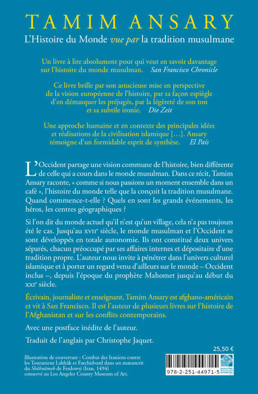 L'Occident partage une vision commune de l'histoire, bien differente de celle qui a cours dans le monde musulman. Dans ce recit, Tamim Ansary raconte, comme si nous passions un moment ensemble dans un cafe, l'histoire du monde telle que la concoit la tradition musulmane. Quand commence-t-elle ? Quels en sont les grands evenements, les heros, les centres geographiques ? Si l'on dit du monde actuel qu'il n'est qu'un village, cela n'a pas toujours ete le cas. Jusqu'au XVIIe siecle, le monde musulman et l'Occident se sont developpes en totale autonomie. Ils ont constitue deux univers separes, chacun preoccupe par ses affaires internes et depositaire d'une tradition propre. L'auteur nous invite a penetrer dans l'univers culturel islamique et a porter un regard venu d'ailleurs sur le monde - Occident inclus -, depuis l'epoque du prophete Mahomet jusqu'au debut du XXIe siecle.