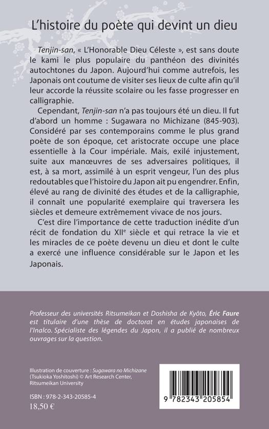 Tenjin-san, « L'Honorable Dieu Céleste », est sans doute le kami le plus populaire du panthéon des divinités autochtones du Japon. Cependant, Tenjin-san n'a pas toujours été un dieu. Il fut d'abord un homme : Sugawara no Michizane (845-903). C'est dire l'importance de cette traduction inédite d'un récit de fondation du XIIe siècle et qui retrace la vie et les miracles de ce poète devenu un dieu et dont le culte a exercé une influence considérable sur le Japon et les Japonais.